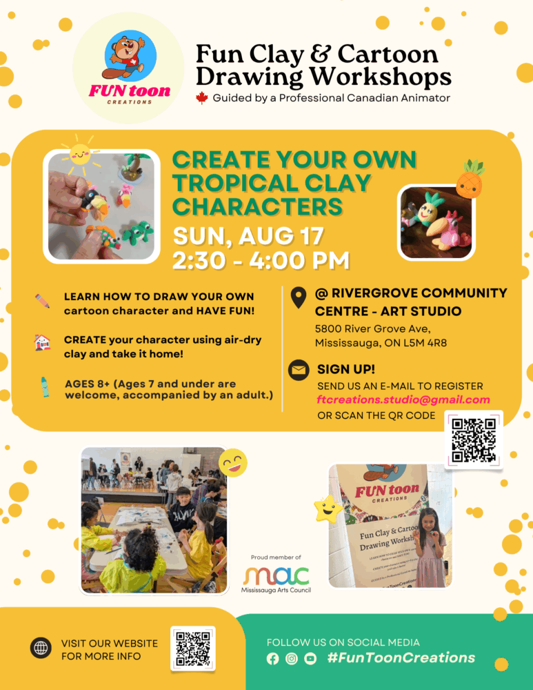 FUN CLAY and CARTOON DRAWING Workshop – Sunday, August 17, 2025 @ River Grove Community Centre Art Studio from 2:30pm-4pm